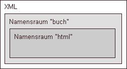 URI, der angibt, auf welchen anderen Namensraum in diesem Element Bezug genommen wird. Dieser URI muss nicht unbedingt eine tatsächlich aufrufbare Adresse sein. Es handelt sich um eine reine Konvention, vergleichbar einer eindeutigen Namensvergabe. Bei eigenen XML-Sprachen können Sie diese Adressen selbst vergeben. Im Beispiel wird http://www.meinserver.de/XML/buch gewählt. Das buch-Element selbst und seine untergeordneten Elemente (Kindelemente) - z.B. das Element kapitel - beziehen sich nun auf den definierten Namensraum. Unterhalb des kapitel-Elements ist im Beispiel jedoch wieder ein Element mit Namensraumdeklaration enthalten: ein html-Element mit xmlns-Attribut. Im Fall von HTML 4.0 sieht das W3-Konsortium dazu die Angabe http://www.w3.org/TR/REC-html-40 vor. Alle Kindelemente, die nun zwischen <html> und </html> stehen, gehören zum HTML-Namensraum (oder: zur HTML-Dateninsel).